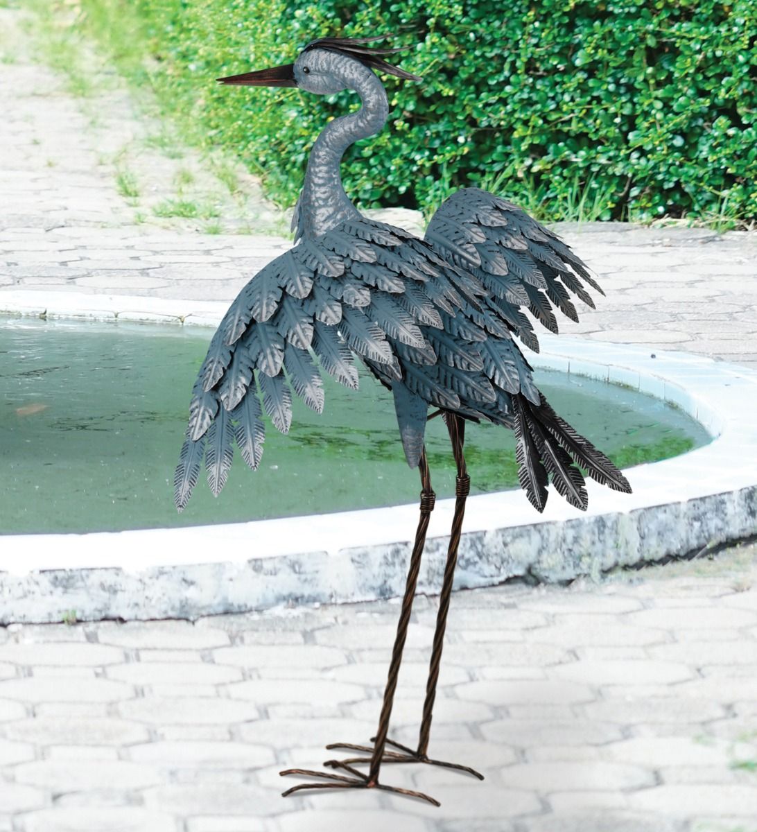 Painted in silvers and blues, each bird looks lifelike and elegant. Dramatic heron statuary with their wings spread display incredible artistry in their feather detail and subtle color finishes in blue, grey and metallic silver.