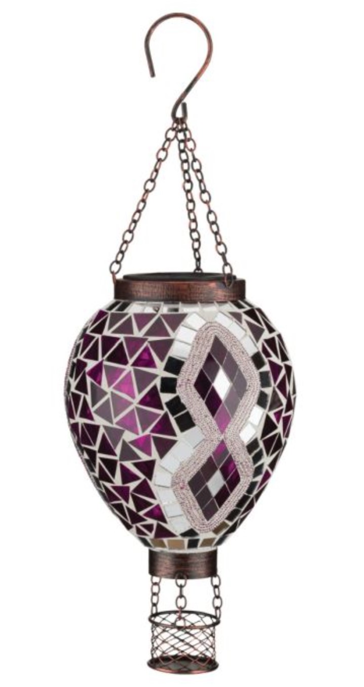 These artistic Solar Lanterns are formed with over 300 pieces of hand laid colorful mosaic glass and mirrors creating a dazzling effect. During the day these balloons glisten in the sun and at night will light up from the solar powered LED light inside. Available in 4 styles/color: Blue, Multi, Green and Purple. Over 300 individually placed glass pieces Chain and hook included for easy hanging6-8 hours of continuous light at night Replaceable rechargeable batteries Waterproof solar panels Weather & fade resistant paint