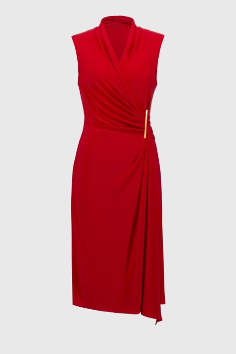 This sleeveless dress is a wardrobe winner that transitions easily from workweek to weekend. It features a lovely mock collar and wrap neckline, detailed with shirring at the front and back. Crafted from a luxe silky knit that falls beautifully below the knees, it's adorned with a lovely ornament detail at the front.