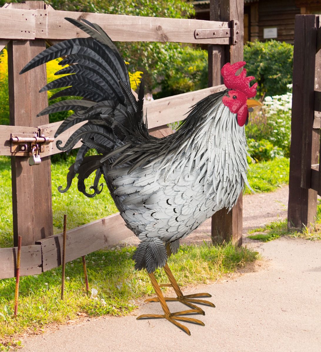 The largest item in the Sussex Rooster collection, this all metal rooster statue is a large 34 inches tall with hand-painted and detailed feathers. The tail feather section can be separated from the body for shipping/storage.