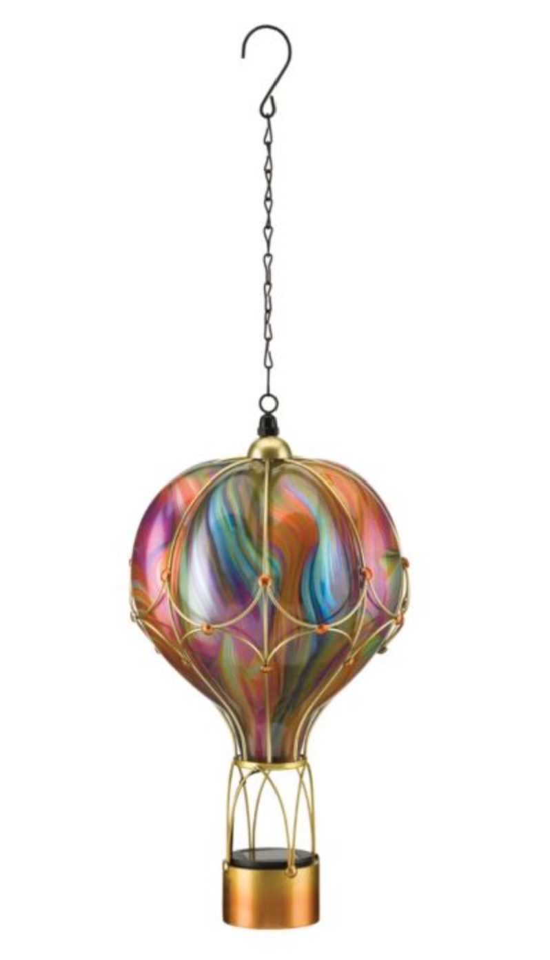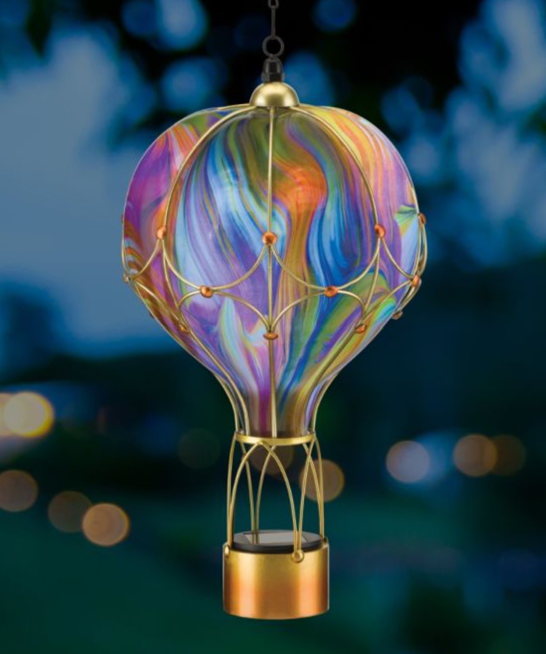 Hand blown glass Hot Air Balloons with a unique colorful swirl pattern makes these Solar Lanterns stand out. During the day they are beautiful glass sculptures that catch the sunlight. At night the colorful glass lights up from a solar powered LED light inside and appear to be floating in the sky.