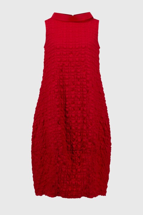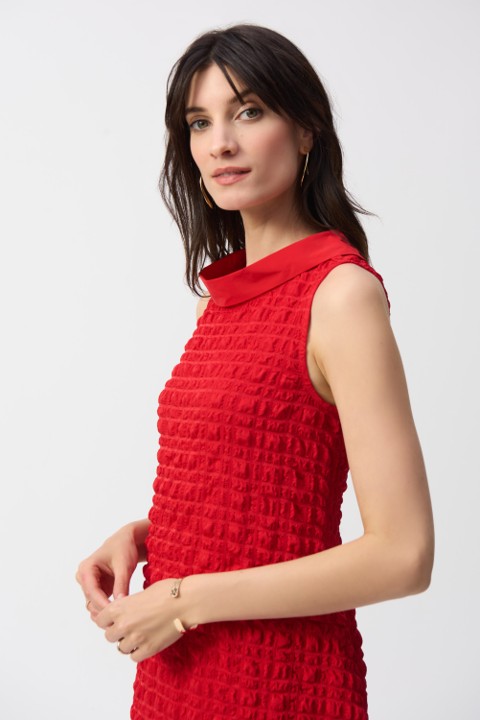 This sleeveless dress features a chic yet relaxed cocoon silhouette tailored from a waffle-textured material and a bold mock neck made from memory fabric. The garment was designed with style and function in mind by integrating side pockets and a back zipper with a lovely hexagon puller.